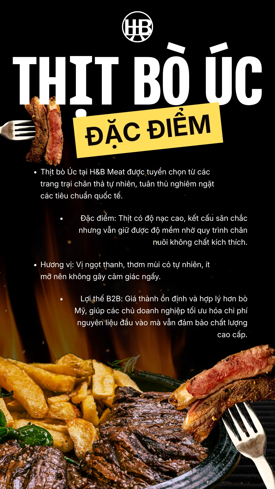 - Giải pháp tối ưu chi phí: H&B Meat tư vấn sâu về các phần cắt (cuts) của bò Úc sao cho phù hợp nhất với menu đặc thù của khách hàng, giúp giảm thiểu hao hụt và tối đa hóa lợi nhuận trên mỗi phần ăn.