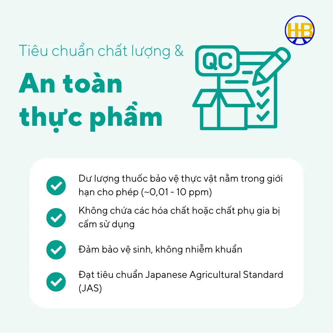 - Thực hiện nghiêm ngặt kiểm định dư lượng thuốc bảo vệ thực vật theo tiêu chuẩn Nhật.