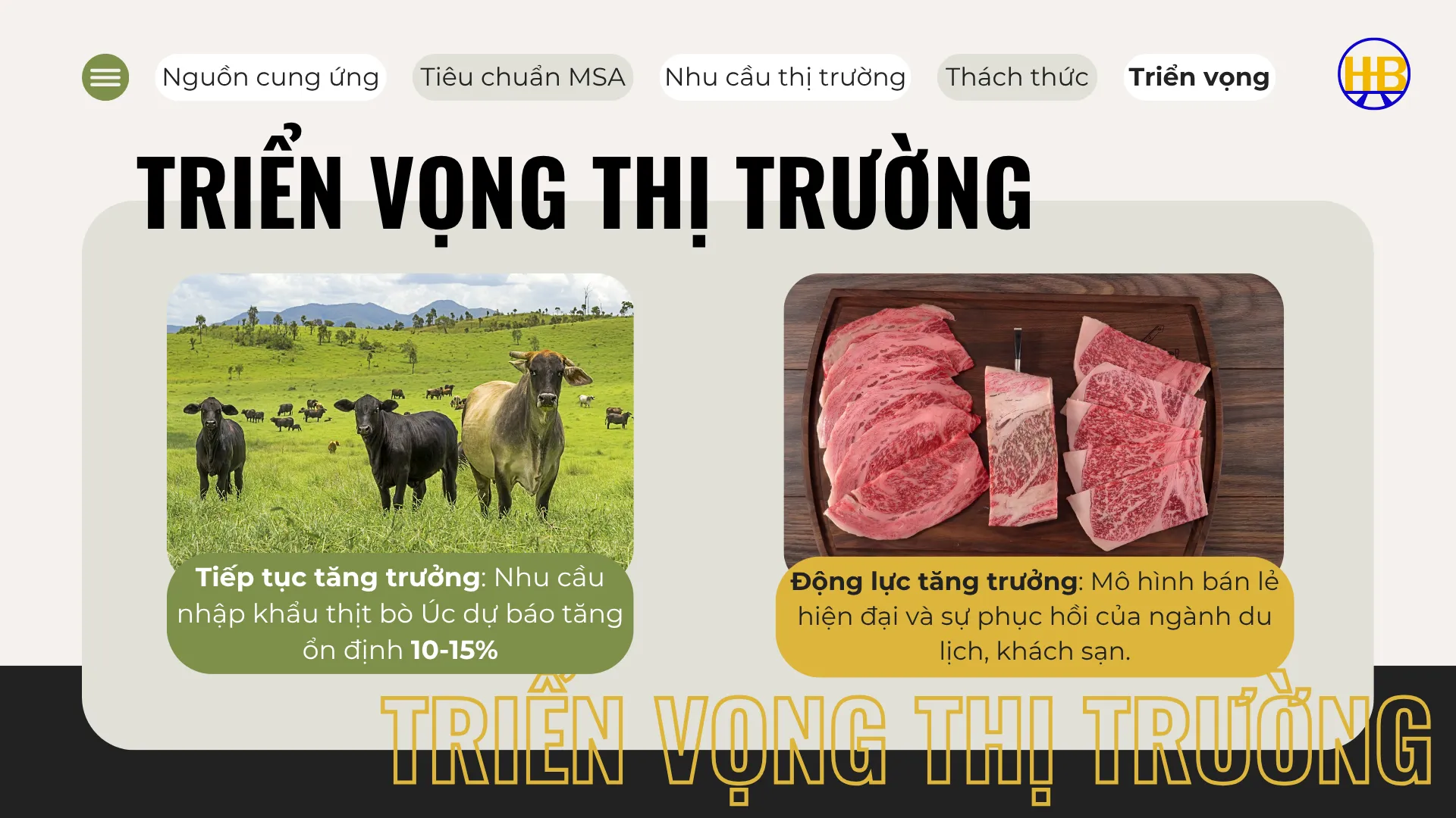 Dự báo từ nay đến cuối năm, nhu cầu nhập khẩu thịt bò Úc sẽ tiếp tục tăng trưởng ổn định từ 10-15%. Sự lên ngôi của các mô hình bán lẻ hiện đại và sự phục hồi của ngành du lịch, khách sạn sẽ là động lực chính thúc đẩy thị trường.